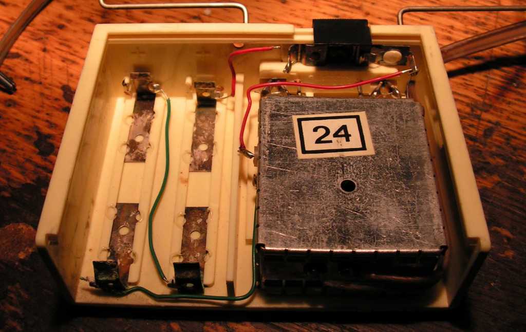 A dobozka tartalma. Mint az látható, nem sok minden van benne. Ezt kaptuk 253 forintért. A szerkezet 6 voltról üzemelt, amit két un. bottelep biztosított. Ilyet ma már nem is lehet kapni. Két cella volt egymás mögött egy papírhengerbe szerkesztve. Persze a rutinosabbak csengőreduktor felhasználásával barkácsoltak hozzá egy hálózati tápegységet. |