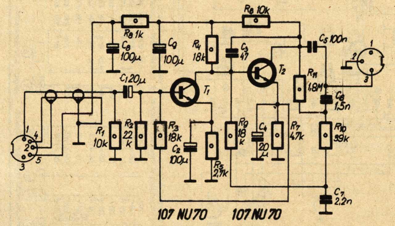 A kapcsolási rajzra tekintve azt látjuk, hogy van ennek a magnónak egy szokatlan tulajdonsága, mégpedig az, hogy egy keverővel kezdődik! Két felvételi szintszabályozó potméter is van benne, hozzá két legelső tranzisztor. A jobb oldali gomb egyben a hálózati kapcsoló is, a műszer pedig a műszer. Érdekes dolog, de a műszert (régebbi magnókon a varázsszemet) lejátszáskor kikapcsolták. Ez persze csak egy egyszerű átkötés, miután máris működik a műszer lejátszás közben is. |