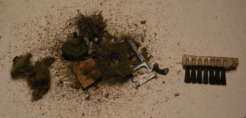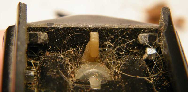Kicsit távolabbról nézve úgy tűnik, mintha szivacs, esetleg szétmállott filc lenne, de az bizony mind szőr! Már csak ebből is kiderül, hogy jelen borotva gazdája idővel teljesen elfelejtkezett a gép takarításáról. Mármint ennyi szőr csak úgy juthat be a már-már teljesen zárt dobozba, ha megtelik a sziták mögötti tér, s a szőr nem tudván hova menni, valahogy mégiscsak betüremkedik a késeket meghajtó tengelyek mellett. |