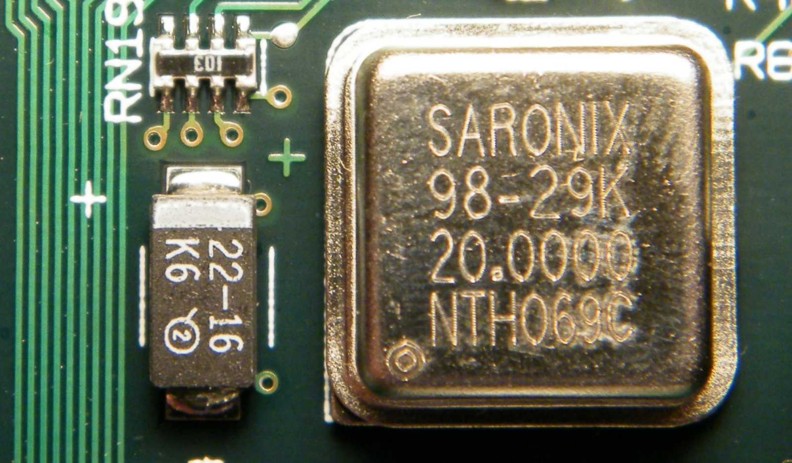 A fényes puttony egy 50 Megahertzes kvarcoszcillátor.