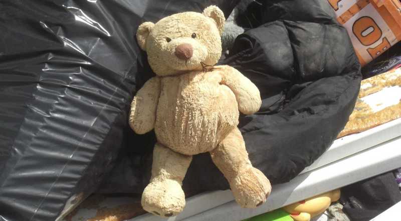 Mikor a kidobott, épp csak szájafoszlott mackó lefényképezéséhez megálltam, idővel odaállt mellém egy nem a szoláriumtól barna kislány, majd megkérdezte, hogy nem lehetne-e a mackó inkább az övé. Mivel amúgy sem akartam elhozni, ezért nekiadtam, amit a gyerek udvariasan megköszönt, majd a macit a hóna alá csapva boldogan elrohant. |