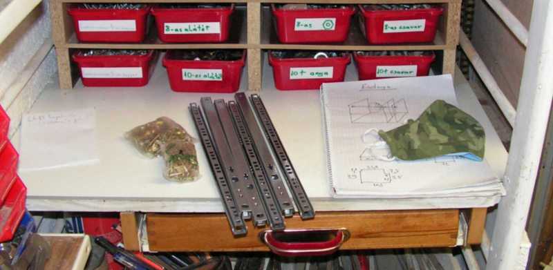 Íme a fiók alja, immáron beleállítva a fiók homloklemezébe. Most, hogy végre összeállt a konstrukció, csak ellenőrzöm a méreteket, leszabom az oldallapokat, majd összecsavarozom az alkatrészeket. |