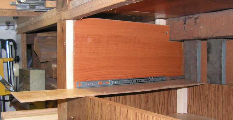 Épp csak hosszabbak a kelleténél néhány centivel. Mivel ebből a fajta sínből nem olyan egyszerű levágni (de csak mert spéci görbítések vannak rajta), így a két új fiók valószínűleg egyszerűen csak fadarabokon fog csúszni, ami nem hinném, hogy a használatukban zavarni fog. |
