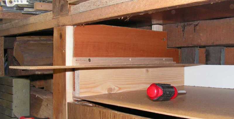 Bár erről korábban szó sem volt, de mint az időközben kiderült, illetve az előbbi képen látszik is, ezt a fadarabot kénytelen voltam a helyéről kiszerelni. Mármint azért, mert miközben ez a fadarab majd egy centivel kiáll a polc síkjából, addig a fiók széle richtig ezen csúszik. Miután levágtam róla a felesleget (lásd a vékony kék vonalat), már nem billen rajta félre a fiók. |