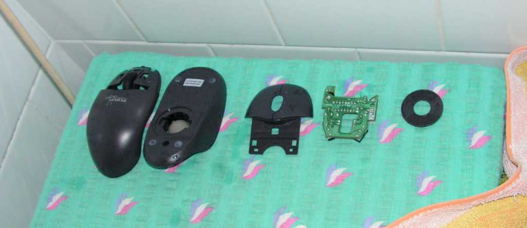 Az egér alkatrészei a csapban. Bár áram szokott benne lenni, ennek ellenére az egér részei jól moshatóak. A művelet nem befolyásolja negatívan az egér későbbi működését. Az egérrel ellentétben a patkány már eleve nedves környezetben él. Viszont ha szétszedjük és kimossuk, az visszavonhatatlanul megváltoztatja (valójában meg is szünteti) a különböző összetevők eredetileg még jól összehangolt működését. |