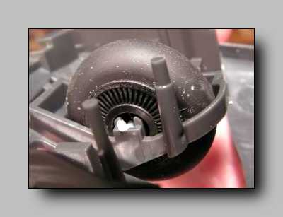 Így néz ki a két tárcsa és a golyót oldalról kitámasztó görgő. Nem bonyolult. Ennél már csak a patkány golyója van egyszerűbben beszerelve. Be van rakva egy bőrzacskóba és kész. |