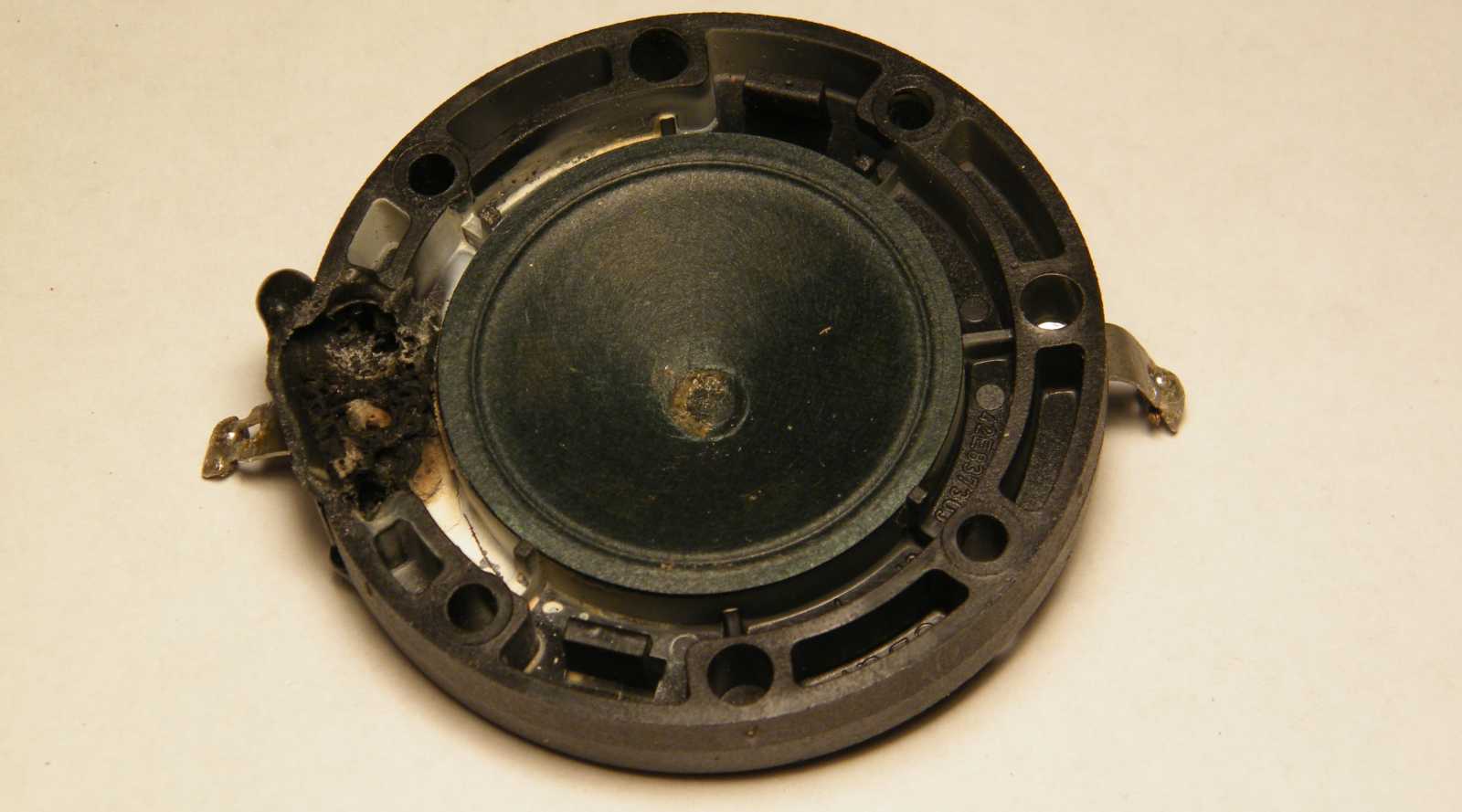 A működési elv talán ezen a példányon a legszemléletesebb. Először is van valamiféle rugalmas felfüggesztés, ami jelen esetben egy-egy a peremen mindkét oldalról körbefutó gumikarika. Aztán van valamiféle membrán, ami jelen esetben egy rézlemez. A tulajdonképpeni motor (ami a rézből készült membránt mozgatja) a középre ragasztott (vagy ki tudja mi tartja ott) kerek piezo lapocska, ami a rákapcsolt elektromosság hatására változtatja a formáját. |