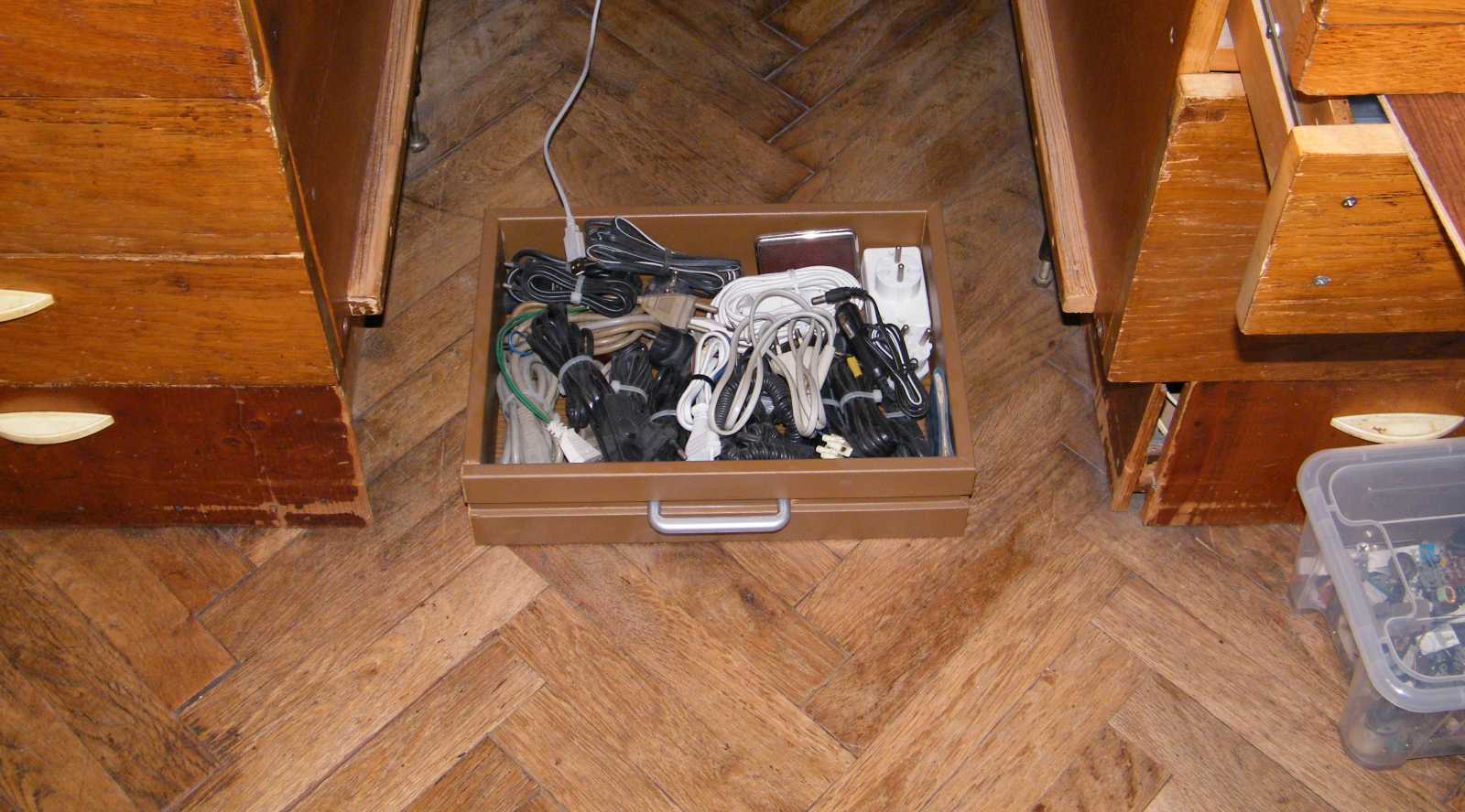 Hogy ne csak negatívumokat említsek, ezért elmesélem (illetve nagyszerűen látszik is a képen), hogy a kábelt az asztal mögé behúzva, a számítógépem mögé vakon leeresztve, annak dugója a hálózati kábeles fiókban landolt, amit a fiók az asztal alól történő kihúzásakor volt oly kedves magával hozni. Vagyis nekem már épp csak be kellett dugnom. Ehhez persze előbb még ki kellett vennem a helyéről másik kábeles fiókot is, majd be kellett feküdnöm az asztal alá egy elemlámpával. |
