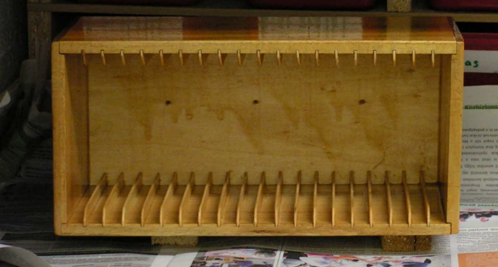 Ami még számomra szintén hihetetlenül hangzik, az az a tény, hogy mindössze néhány hét elteltével sikerült leérnem a pincébe, ahol is már nagyon várt a polcból kilógó csiszolópadra odakészített lemeztartó. Persze nem én vagyok a történetben a lényeg. Akarom mondani igenis, hogy de! Hiszen ugyan ki más szabná ki a tartóba illő osztólapokat, valamint mázgálná szét a fán a lakkot, ha nem én? |