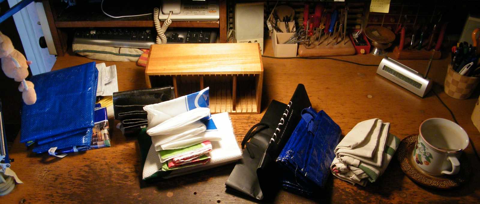 Balról indulva az első dobozban egy e-cigeretta van, míg a két következő henger gumi. Az egyik padló, a másik ragszalag. A sárga fekete csíkos bigyó pedig a már korábban látott mérőszalag. Mindeközben a zöld alaplapos dobozban egy (illetve tulajdonképpen három) sárga színű függöny van, amit sikerült elajándékoznom. A két egymáson lévő doboz a pincébe tart, csak még nincs rajtuk felirat. A szatyrok pedig idővel bele fognak kerülni az épp készülő tartójukba. A három tekercs barna ragasztószalag speciel nagyon nem ide való, így azok, ha nem is most, de idővel el fognak innen kerülni. Szóval lesz itt rend! Kiáltott fel a szerző, hangjából erőst kiérződő hitetlenkedéssel. |