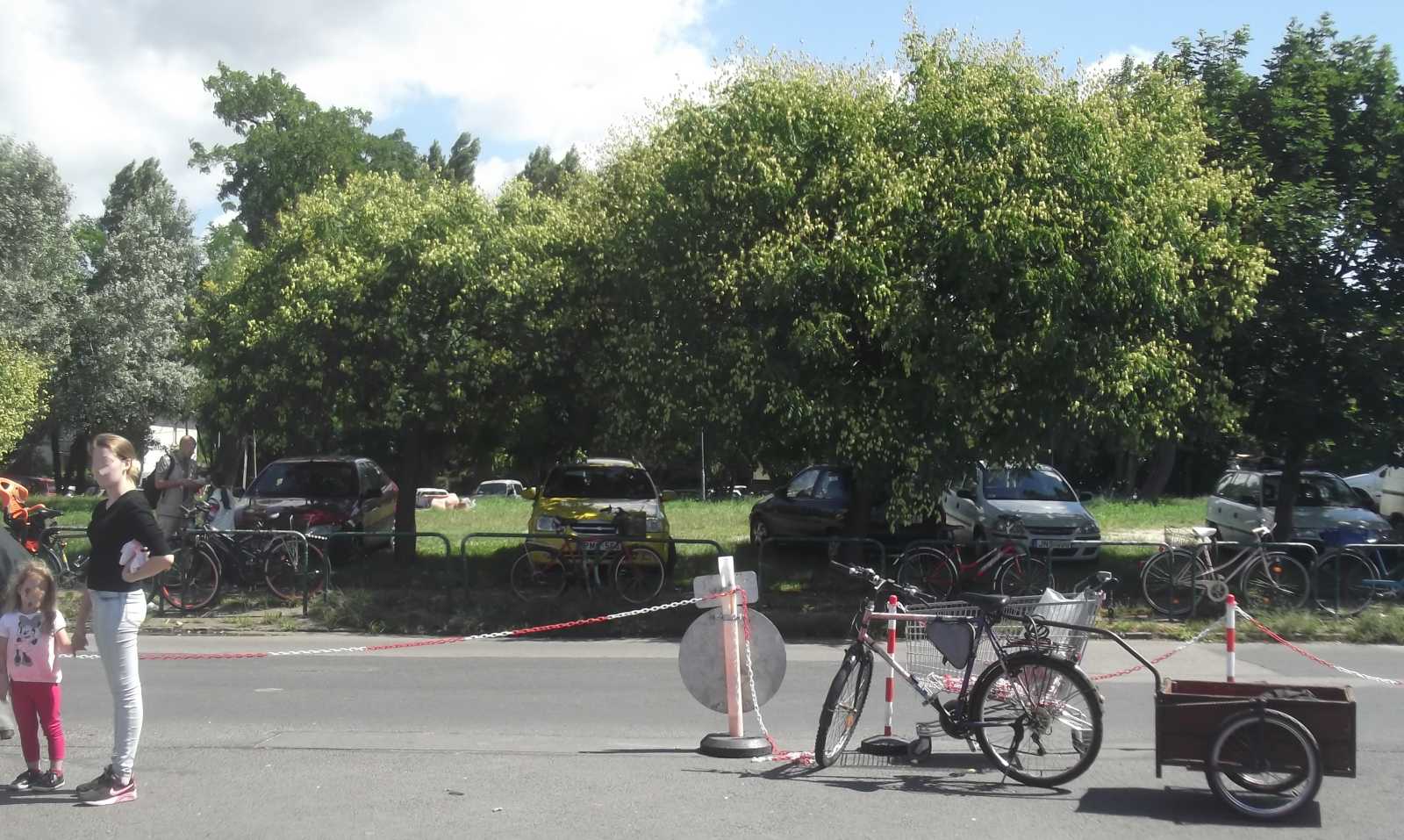 Már a bicajom mellől nézve, valahogy így néz ki a szombati Bosnyák téri piac, ami kevés híján a távolban látható toronyházig tart. Miközben én nagyban a bicajt őrző lakat kinyitásával voltam elfoglalva, akkor történt, mondhatni épp a megfelelő pillanatra időzítve, hogy bár a jelenlegi pozícióm és a piac között van egy kétsávos, ráadásul meglehetősen forgalmas út, ennek ellenére a lopottnak tűnő holmikat áruló ember úgy rohant felém, mint akit igencsak üldöznek. Ez amúgy éppen így is volt! Egy huszonéves forma srác volt a kergető. Neki mondjuk volt annyi esze, hogy nem vaktában rohant át az úton. |