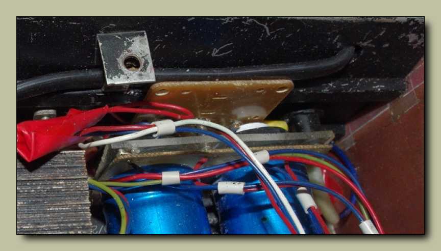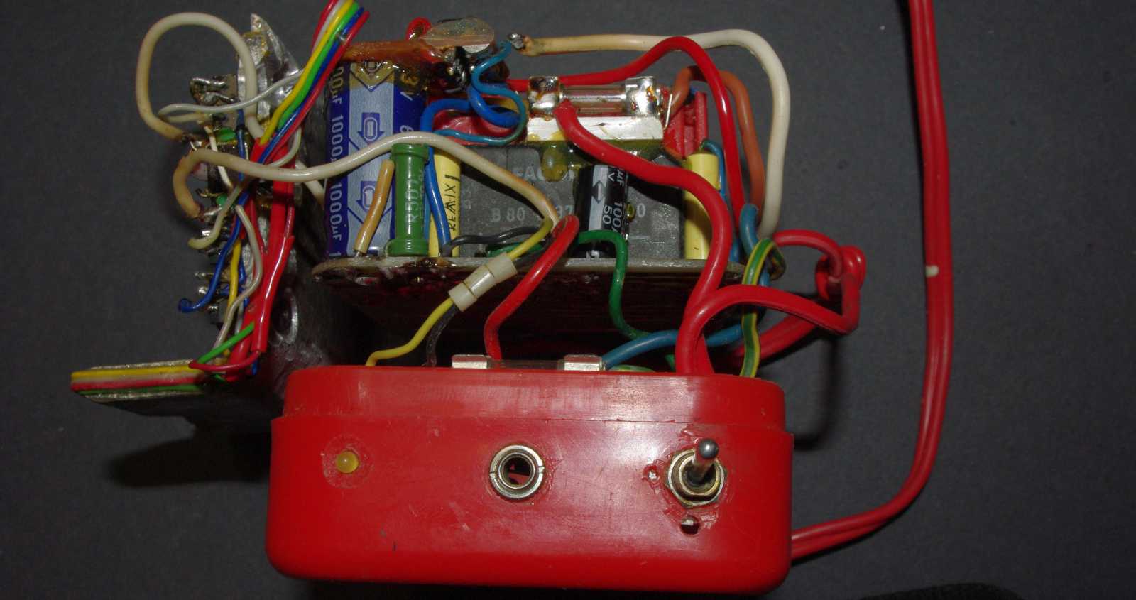 Szegény trafó - a dobozba nem férvén - kilógatásra került a fenéklemezből.