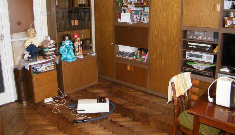Legyen már meg ez a rohadt fúgázás, hangzott el az ominózus mondat a project közben egyre gyakrabban. Ezen a képen még ott a szekrénysorban a tévé alatt a lengyel deck, a virágállványon a videós kaputelefon, és még a fürdőszobai mérleg is. |