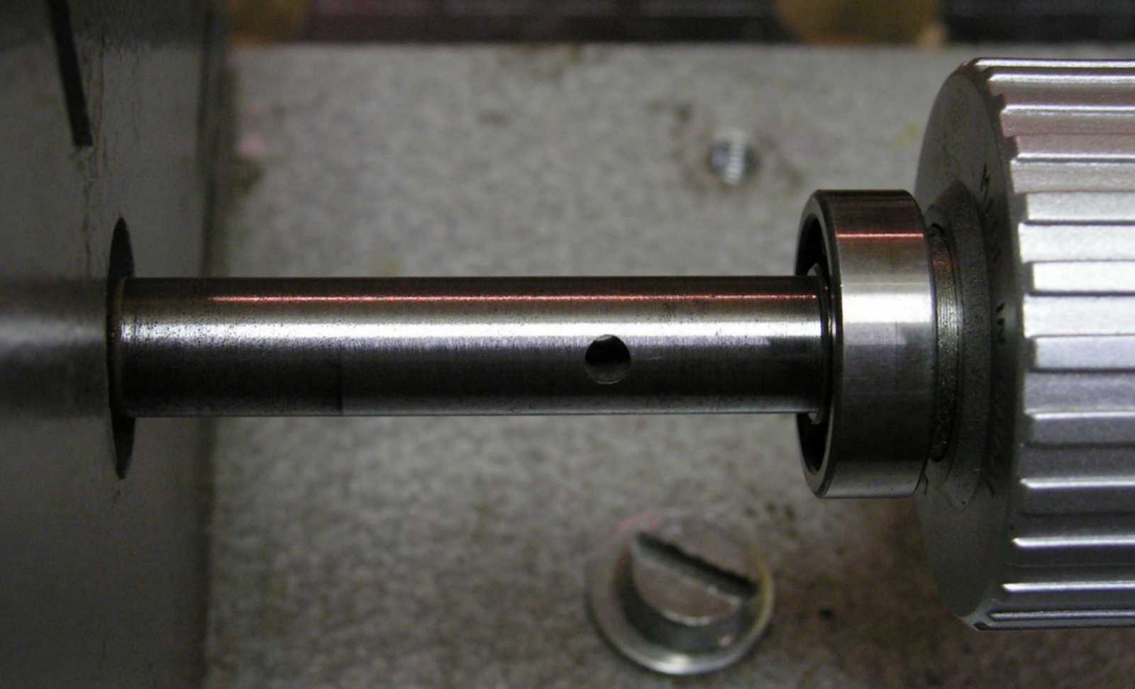 Majd a túlméretes anyát felszereltem egy 8-as csavarra, amit aztán befogtam az éppen a jelen cikk keretében felcsapágyazni szándékozott tengely végére pörgetett tokmányba. Ez az összeállítás annyira instabilra sikeredett, hogy meg sem mertem próbálni rámenni az anyára. Már úgy értem, hogy valami olyan szerszámmal, ami látható nyomot képes rajta hagyni. |
