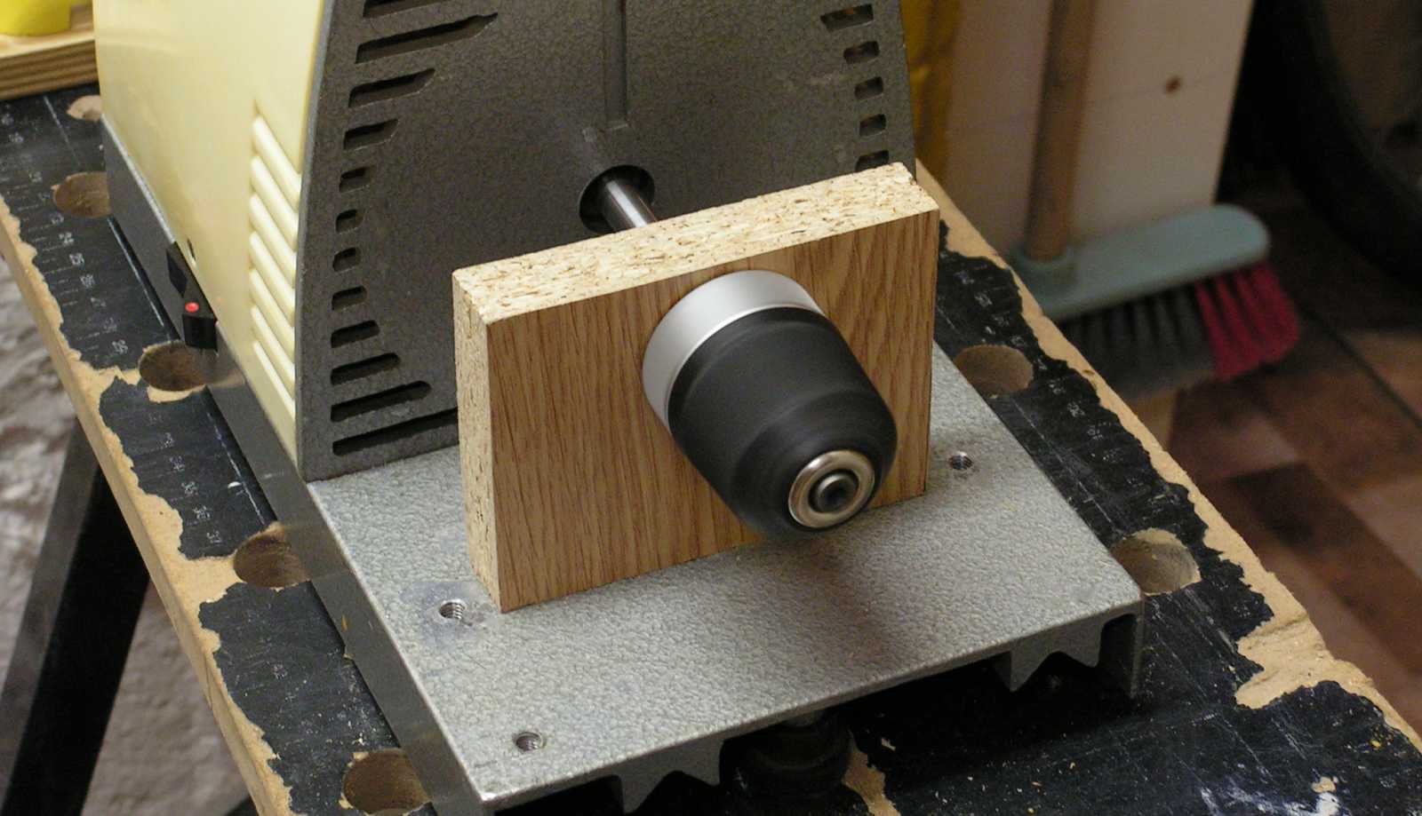 A csapágyházat szerintem úgy a legegyszerűbb elkészíteni, hogy kétszeresére növelem a késtámasz fadarabjának méretét, majd fúrok bele egy pontosan 22 milliméteres, vagyis csapágynyi méretű lyukat. |