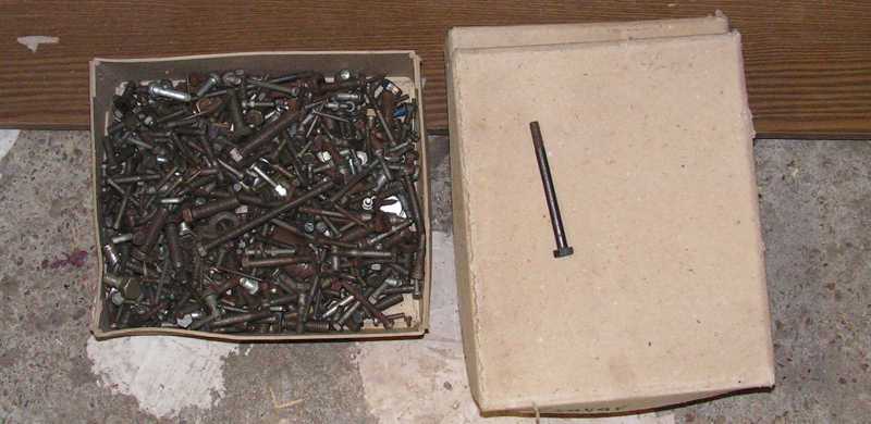 Aztán beugrott ez a még szét nem válogatott tartalmú, még a motoros időkből származó csavaros doboz, melyben épp a kupac tetején virít egy a keresett méretű M8-as csavar. Valószínűleg azért ez volt felül, mert ugye szép hosszú, s legutóbbi itt jártamkor ezzel esett jól turkálni a dobozban. |
