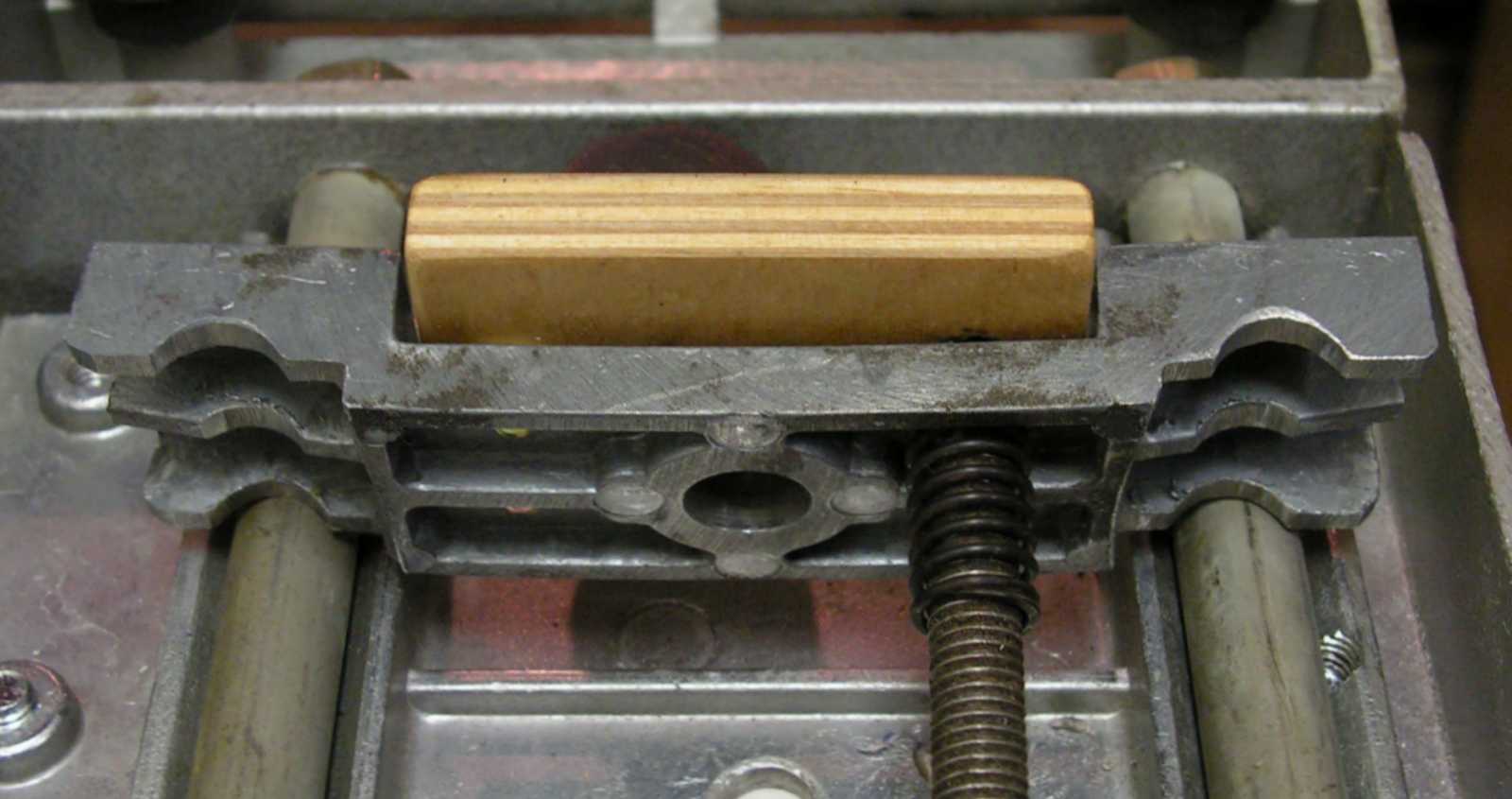 A késtámasz ezen végét megtartó fadarabot rögzítő lyuk ugyan jó helyen van (épp mint a másik, csak innen nézvést felénk közelebb), a fadarab azonban már nem fér oda az eddigi pozíciójába a késtámasz elkészülte óta felkerült tokmánytól. |