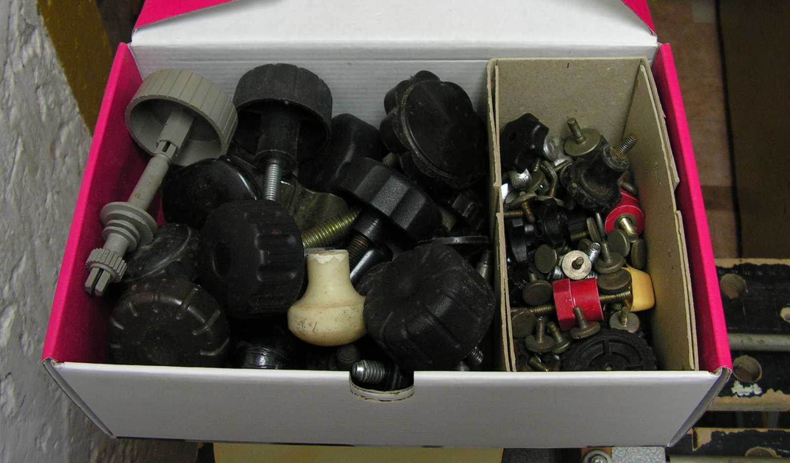 Mivel ez lett volna az elsődleges fellelési helyszín, ezért a nagyfejű csavaros dobozba néztem bele utoljára. Természetesen itt sincs amit keresek, pedig itt aztán a ma legyártandó valamihez sok nagyon hasonló formájú valami van, csakhogy ezek zömükben csavarok, nem pedig anyák. |