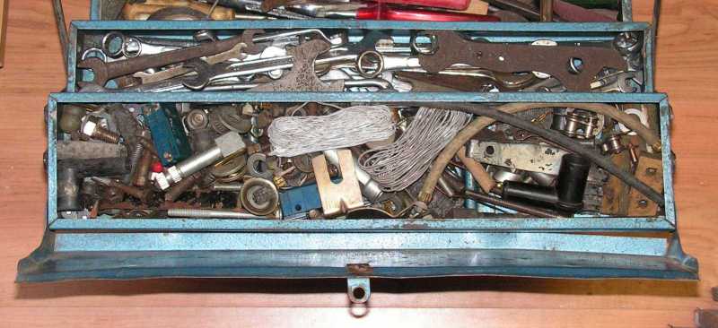 Ez itt motoros időkből megmaradt anyás / alátétes doboz, melynek tartalmát azért nem egyesítettem a többivel, mert ugye ezek a vasak koszosak. Hogy hogyan fogom őket megtisztítani? Mivel a tömegük és az olajosságuk okán ez egyenként sziszifuszi feladat lenne, ezért tömegesen, csak ehhez előbb még el kell készüljön a már ki tudja mióta, pláne hányszor megálmodott csiszolómalom. |
