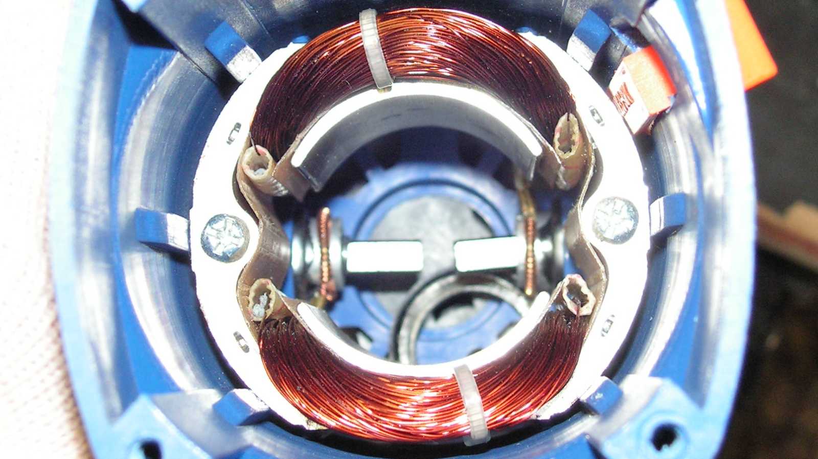 Ezzel a képpel azt szerettem volna megmutatni, hogy az állórész tekercselése egyrészt nincs kiöntve lakkal (vagy ki tudja mivel szokták a tekercselést impregnálni), másrészt a huzalok összefogatásához hőre lágyuló kábelkötegelőket használtak. Na most ami még feltűnt a képen, az a mélyben ki tudja honnan odakeveredett karika. |