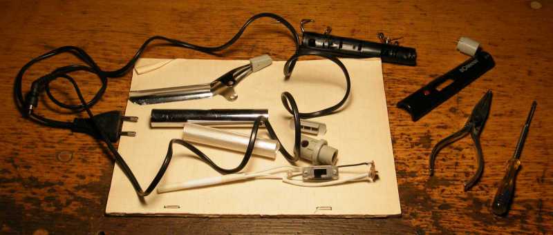 Krómozott cső (ez mondjuk még akármire is jó lehet), elektromosan szigetelő, de a hőt jól vezető, csőformára tekert csillogó lap, formátlan, de azért kerek műanyag alkatrész, szakadt fűtőbetét, valamint kapcsoló. Szerintem ezeket az alkatrészeket mind el fogom tudni tenni. Amit meg nem, az bőven belefér a vödörbe. |