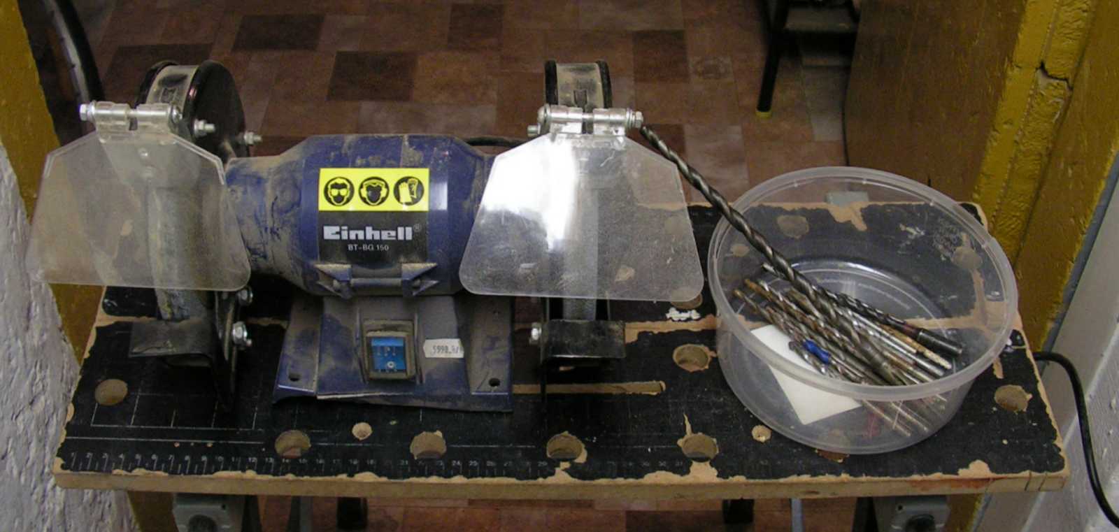 A köszörűkő egy hatalmas csavarral van rögzítve. Az anya azért nem forog le a tengelyről, mert a köszörűkő terhelésekor automatikusan megszorul. Hogy ez a másik oldalon is éppen így legyen, az ottani anya nem jobb, hanem balmenetes. |