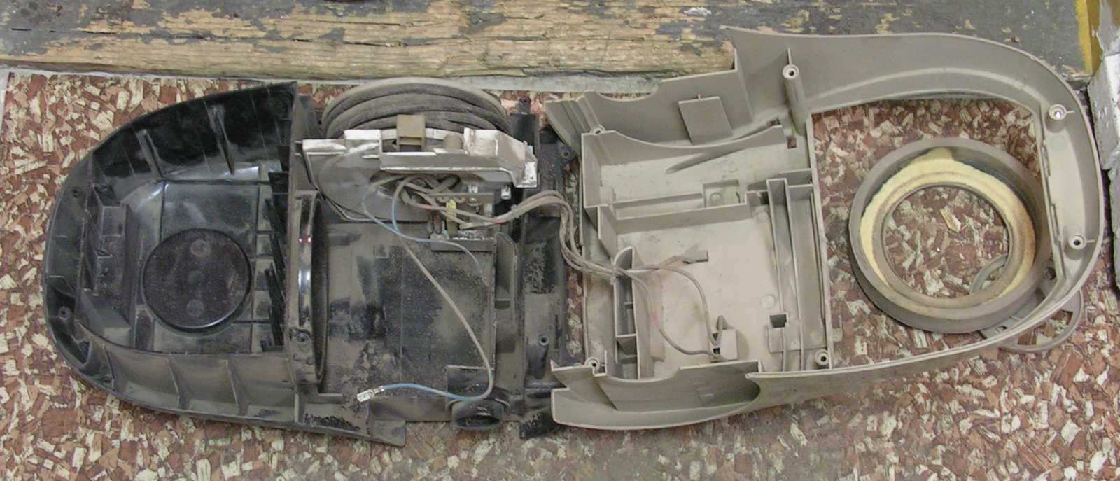 Mármint idáig, ami egyben a porszívó végét is jelentette, amit ugyanis ezen a képen látunk, az eredetileg nem két alkatrész, hanem csak egy. Konkrétan arról van szó, hogy a motor vázából préseléssel ötletesen kiképzett csapágyház egyszerűen levált a homloklemezről. Ezt a hibát sajnos csak a visszahegesztése által lehetne meggyógyítani, ami azért nem járható út, mert egyrészt nincs hegesztőtrafóm, másrészt nem is tudok hegeszteni, harmadsorban pedig a motor ezen részlete még véletlenül sem szétszedhető módon lett összeállítva. |