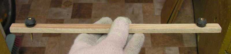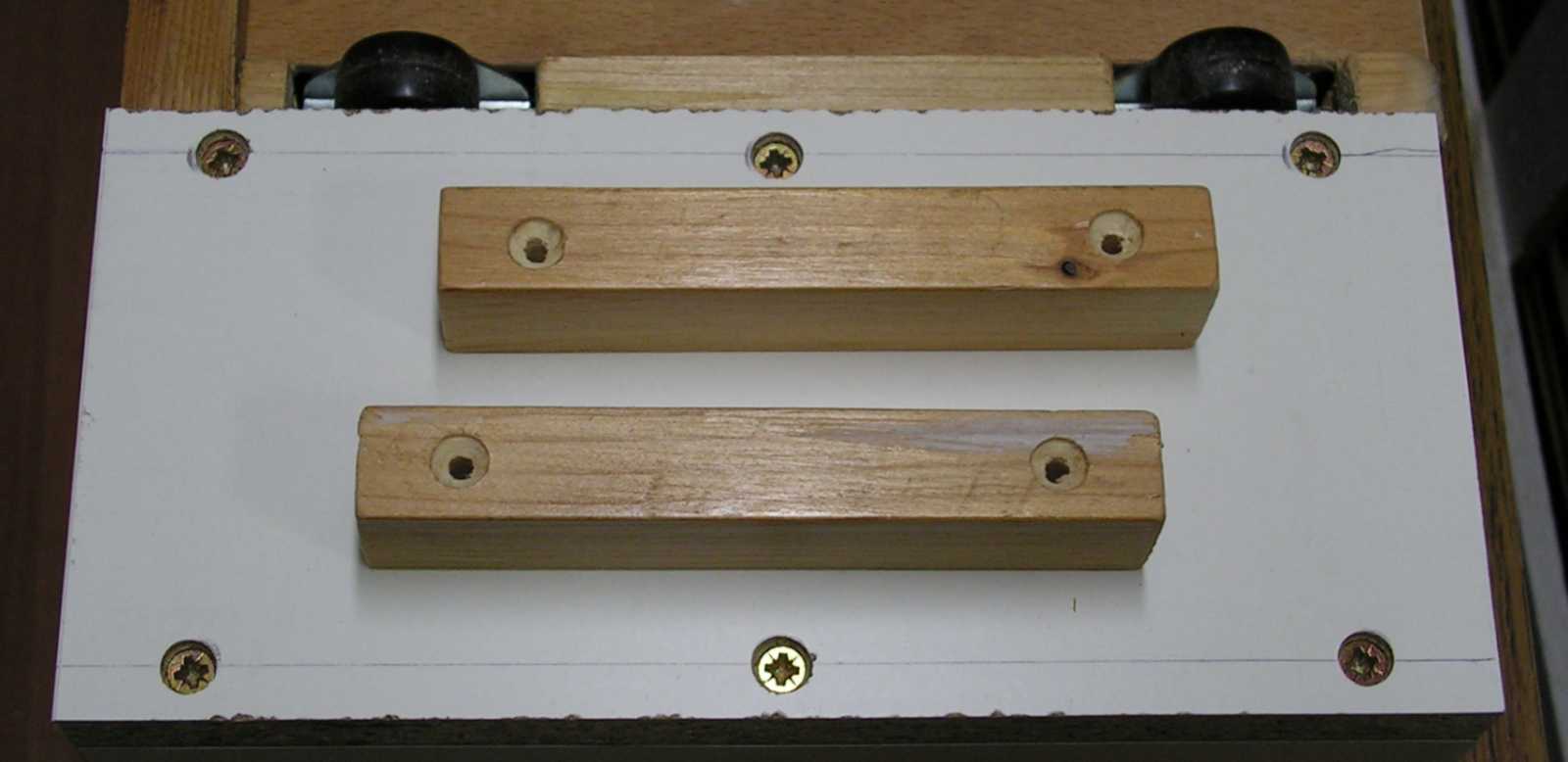 Betettem a lábak közé a fiókot, majd megtekintettem a mögötte található helyet. Mivel ott azt láttam, hogy a sarkokba szerelt egy-egy fadarabbal a fiók a tetejénél fogva stabilan megtámasztható, elindultam felkutatni a két szükséges fadarabot. |