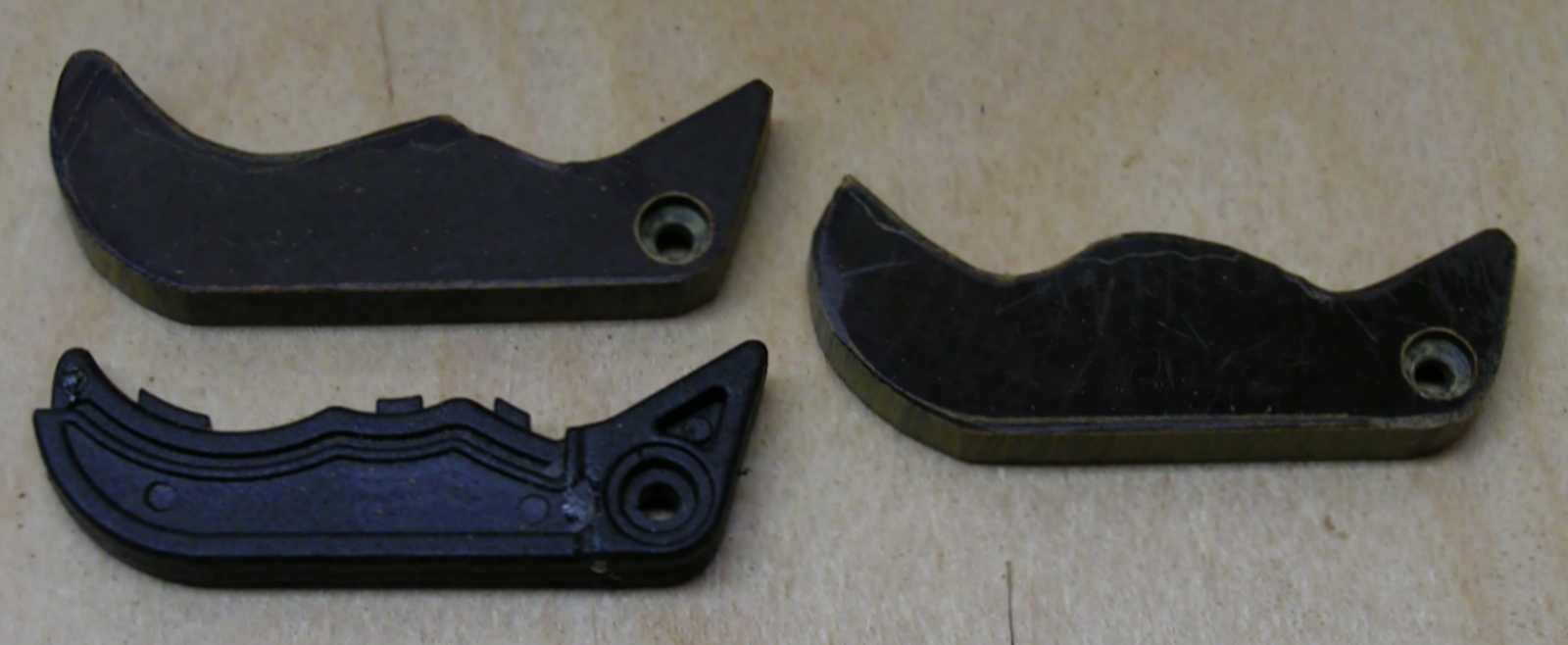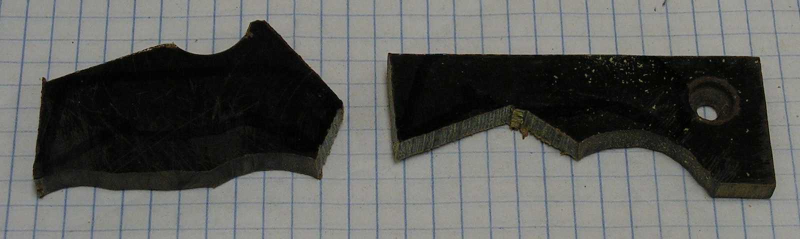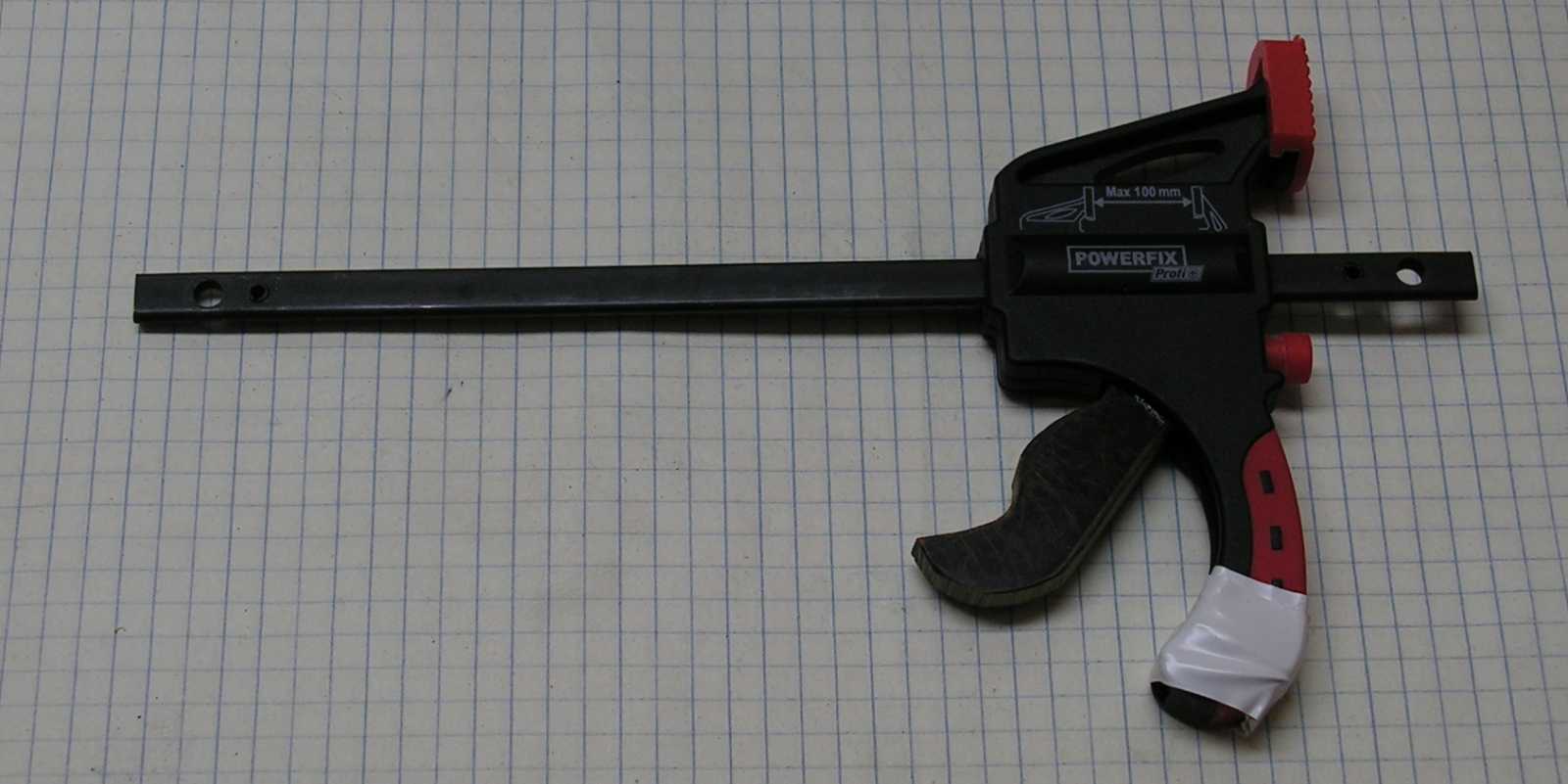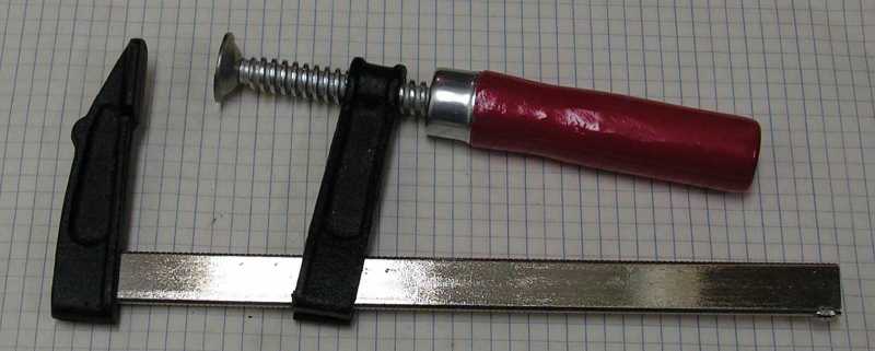 Ez a kép már a ki tudja miért a lakásban maradt asztalos szorítót, pontosabban szólva a belsejét mutatja. Mivel a karocska feladata mindössze annyi, hogy a balra látható hegyesebbik vége nyomogassa a két vaslemezt, miközben az ujjam nem csúszik ki a mélyedésből, így ezt a pótlást tökéletesnek kellett minősítenem. |