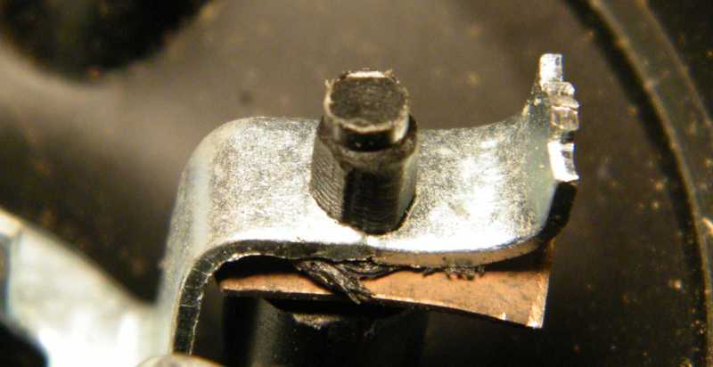 Vannak dolgok melyek úgy jók, ha a végtelenségig le vannak egyszerűsítve, míg akadnak olyanok is, melyekkel ezt azért talán mégsem kellett volna elkövetni. Ez a foglalat szerintem az utóbbi kategóriába tartozik. Bár a járműveken az elektromos csatlakozások alapvetően csúszósarukkal vannak megoldva, azt jelen esetben azért nem lehetett alkalmazni, mert a saru egyszerűen nem fért át az index házába fúrt lyukon. Hogy mégiscsak fel lehessen szerelni a lámpát, ahelyett, hogy egy kicsit nagyobb lett volna a lyuk (amitől persze az index felfüggesztésének is minimum két milliméterrel vastagabbnak kellett volna lennie) csupasz vezetékvéget alkalmaztak. |