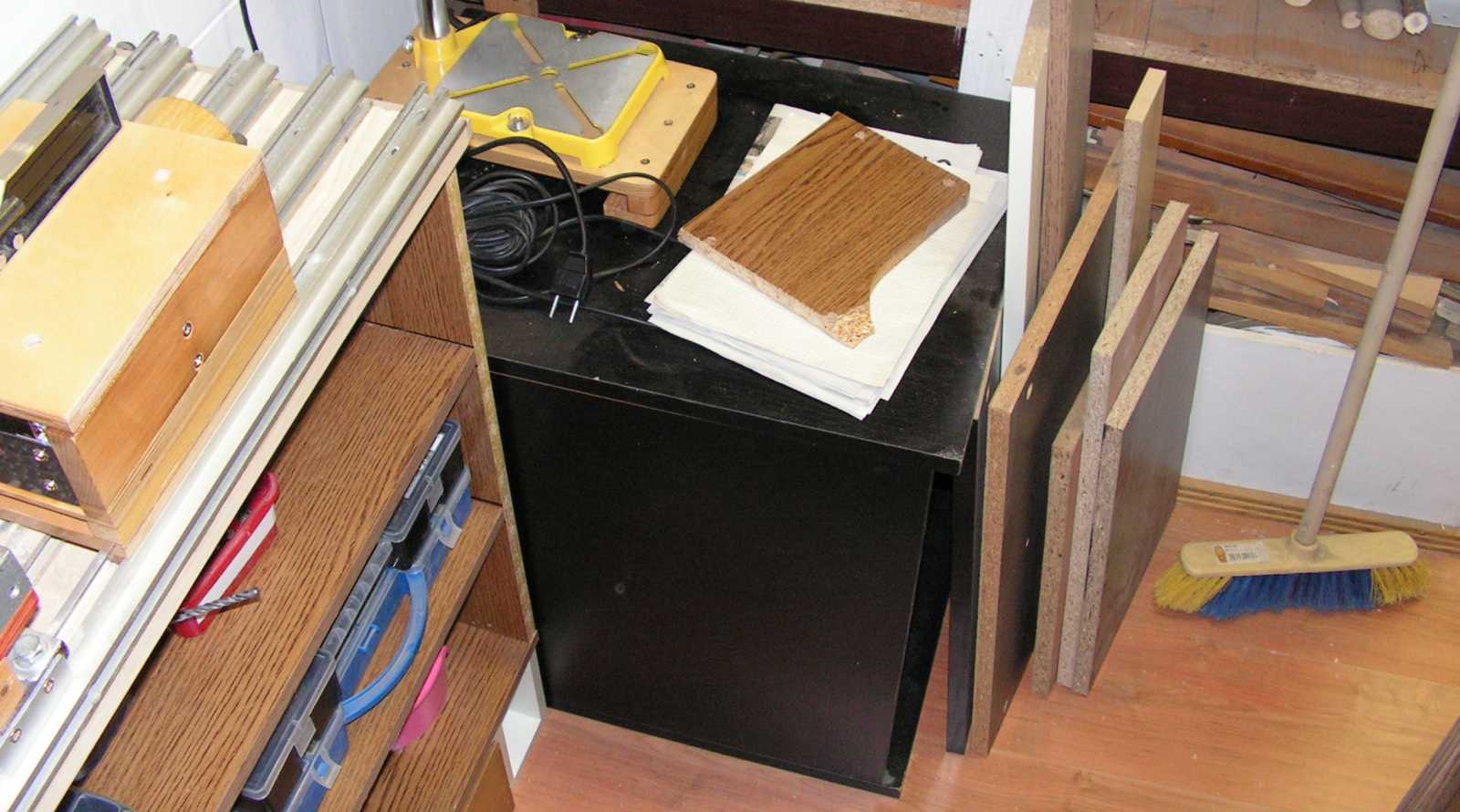 Egy kicsit ugyan szíven ütött, hogy az éppen keresett lécek elkerültek ebből a sarokból, ezen azonban gyorsabban túltettem magam, mint azon a másik tényen, hogy a fekete láda még mindig nincs befiókozva. Mindezt úgy, hogy még a polcba tolható fiókos szekrényke sem készült el. |