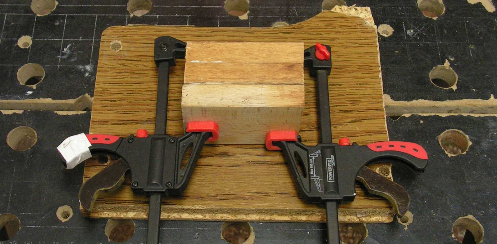 Majd egy másik polcról a két minap kipofozott kisebbik asztalos szorítót, amivel összehúzattam a fadarabokat. A ragasztó megkötésének érdekében a kombináció valószínűleg nem csak holnapig marad így. Aztán persze lehet, hogy lejövök hozzá, de amennyi dolgom a lakásban is van, ezt nem tartom valószínűnek. |