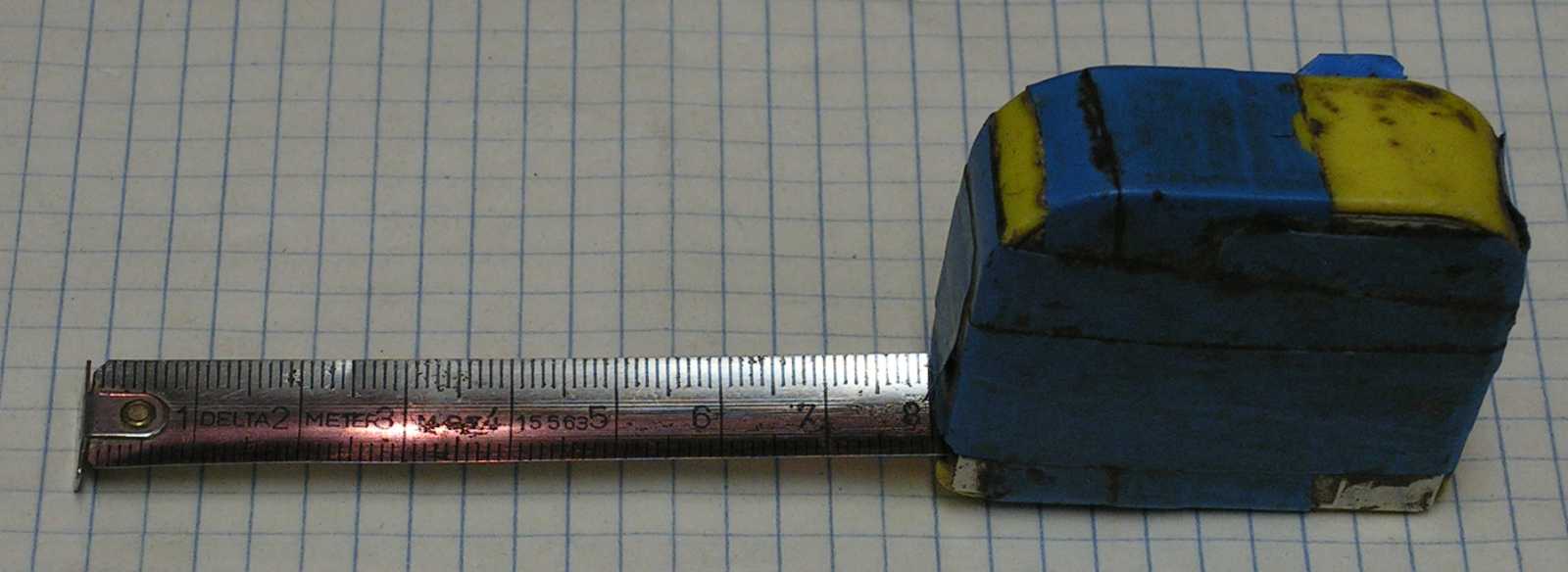 Amit ráadásul nem is rugó, hanem a felhasználó kénytelen visszahúzni a tokba, mégpedig a képen látható, a doboz oldalából kihajtható kurbli tekerése által. Gondoltam most, hogy ezt is megmutattam, akkor most van kész, csakhogy az egyre szitább viselkedésű emlékezetemben felmerült egy újabb mérőszalag képe. |