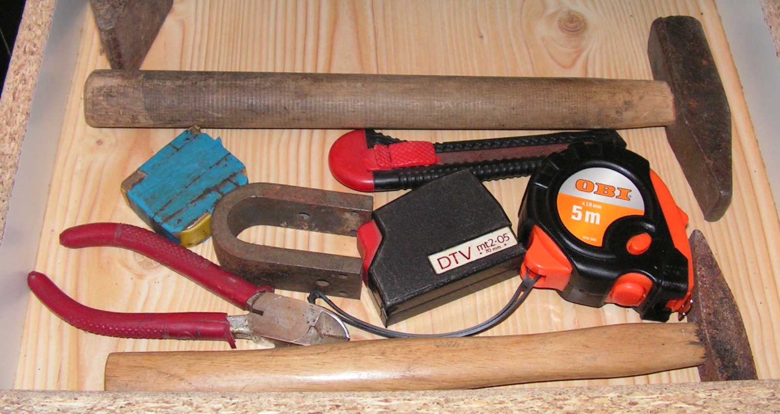 Mely szerszám végül innen, vagyis az elektromos szerszámletevős polcról került elő. Az ollót jórészt azok a leeső fadarabok takarják, melyek a pincei porszívó szétszedésekor megmaradt kábeldob bedobozolásakor keletkeztek. |