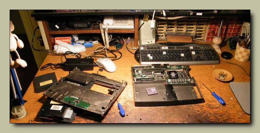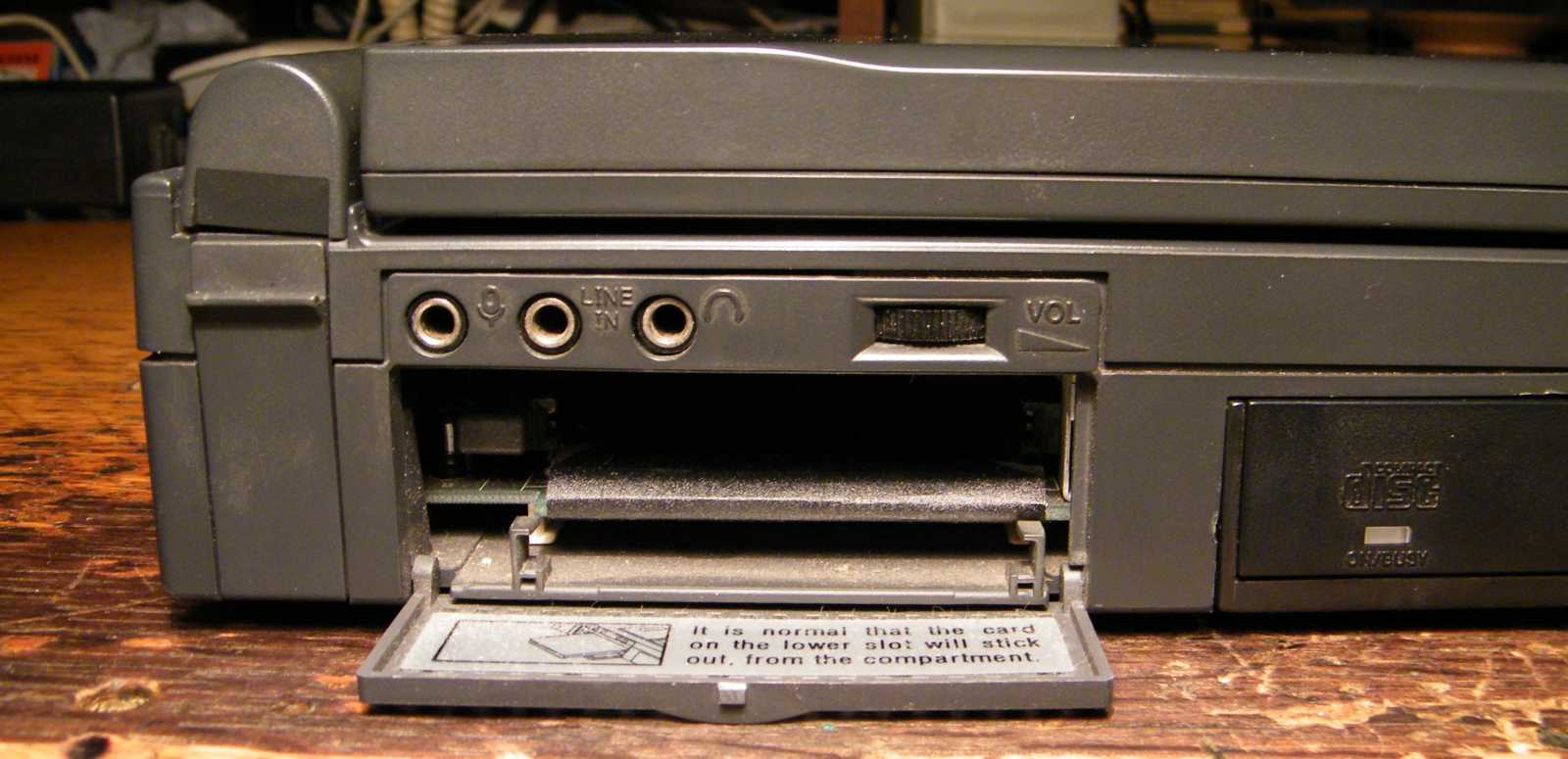 Már az előbb is szemeztem az audió rész alatti apró ajtóval. Ez egy (illetve két) PCMCIA bővítő csatlakozó, ahová modemet vagy akár hálókártyát lehet bedugni. Ugyan se modemet se hálókártyát nem találtam itthon, cserébe viszont találtam egy semmire sem jó illesztőkártyát. |