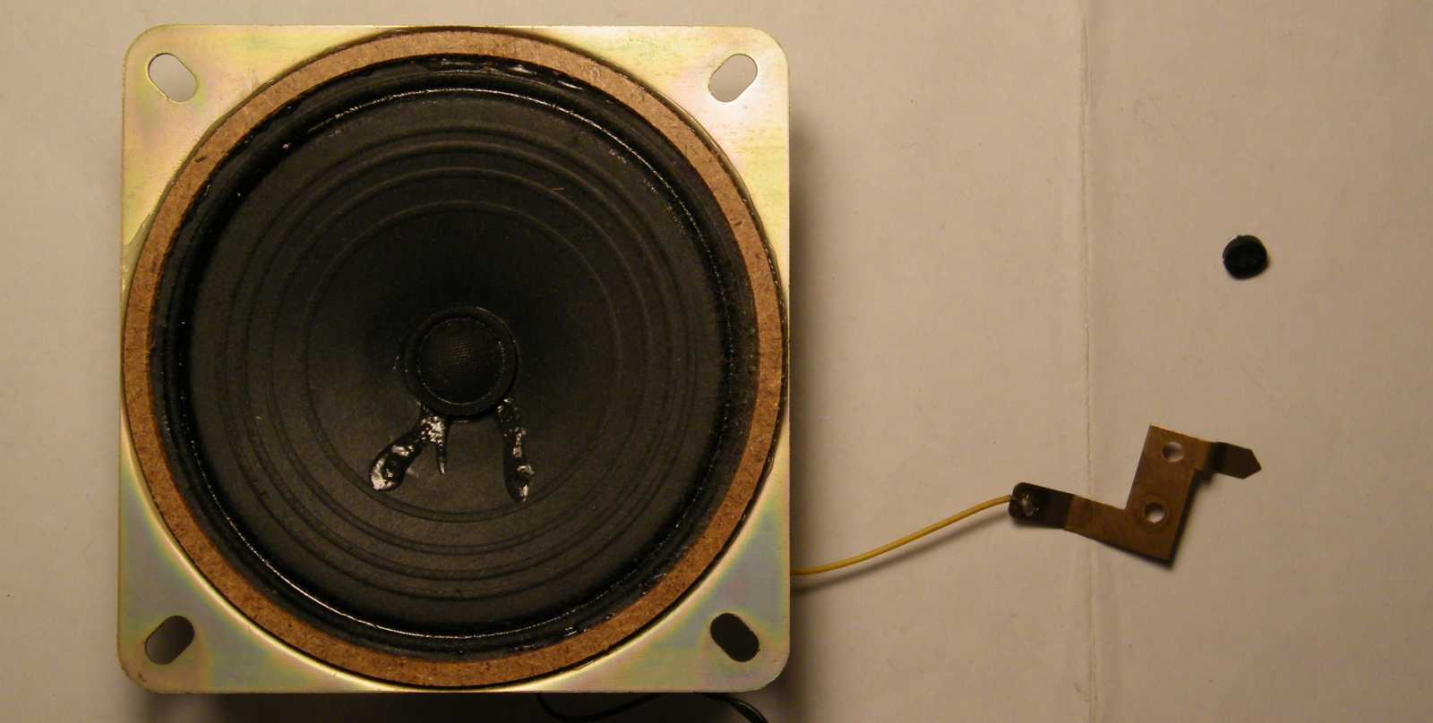A hangszóró szerintem szép, az alóla kilógó sárga vezeték végén fityegő rugólemez a testpontot viszi a fedlapon található fémlemezhez, miközben az apró fekete pont valaha a skálamutatót kötötte össze a húrozással. Most már azért nem, mert időközben ez az alkatrész is elengedett. |