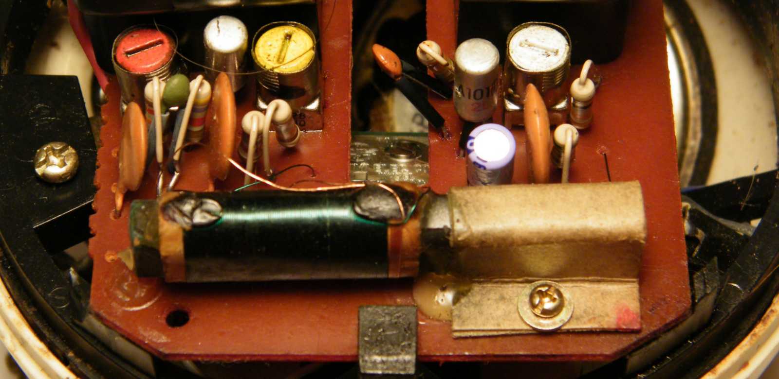 Ez itt a lánc rögzítése, melynek állagából azt sikerült kikövetkeztetnem, hogy ez a rádió sokáig lógott valahol, miközben a láncra lecsapódott a pára, majd belefolyt a rádióba, ahol is ezen a csavaron végezte. Ehhez képest tulajdonképpen nem is néz ki olyan rosszul ez a készülék. |