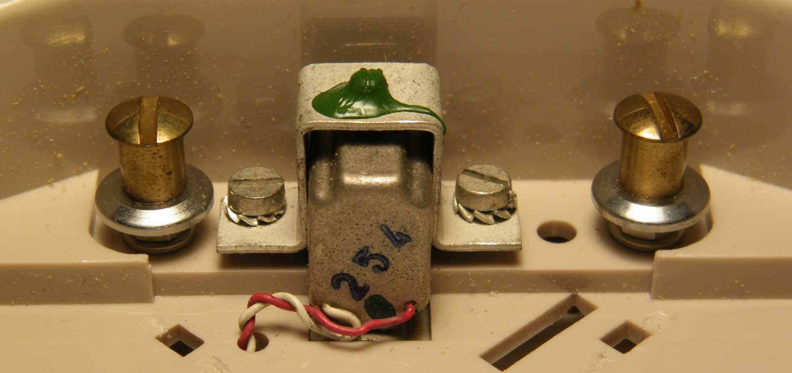 Amit ezen a képen látunk, az a hálózati feszültségválasztó kapcsoló, ami valaha (még az elektroncsöves időkben) egy ennél sokkalta komolyabb szerkezet volt. Már úgy értem, hogy ez azért nagyon igénytelen. |