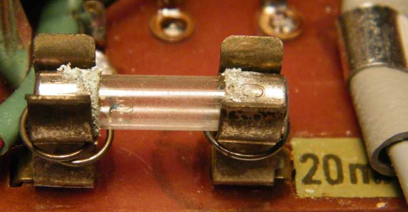 A biztosítékban nem az a szokatlan, hogy kiment, mint inkább az, hogy egyrészt mindkét lábát kiütötte valamiféle sóvirág, másrészt talán még soha sehol másutt nem láttam a biztosítékfoglalat lábait ötletesen összehúzó rugókarikákat. |