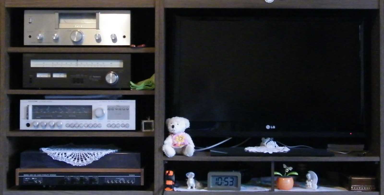 A QUAD405-ös viszont már kevésbé a rövidzárra, ezért a próba előtt egy kissé átrendeztem a banándugókat és a krokodilcsipeszeket. Hogy mit próbálok? Nos most épp azt, hogy a Braun hangfalak normális erősítővel is döngenek-e, vagy a hallott fura hangot a rádió produkálta. Jelentem a rádió a hibás, meg a hangmester, mert a PC-ről zenélve szépen szólnak a hangfalak, míg az Onkyo tunert hallgatva újra kezd előtérbe kerülni a női hangban az abban eredetileg nem is létező fura, és részemről kissé idegesítőnek talált brummogás. |