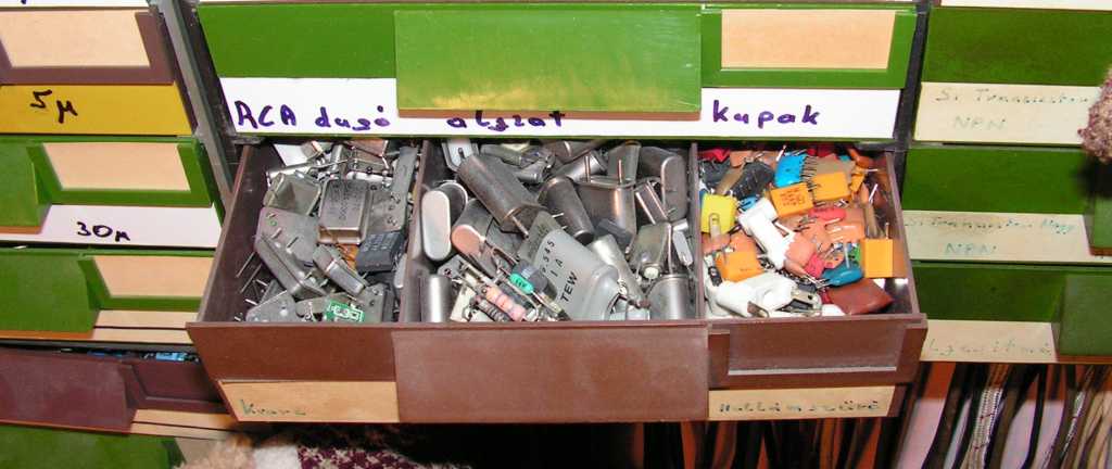 | Ebben a dobozban tartom a 100 ohm alatti ellenállásokat. Útálom elővenni, mert nem fér ki a hangfaltól. Persze régen kifért, mert nem volt ott a hangfal, akkoriban ugyanis két öklömnyi autóhangszórót használtam a QUAD-hoz. Mondjuk nem is igazán hallgattam zenét... |
