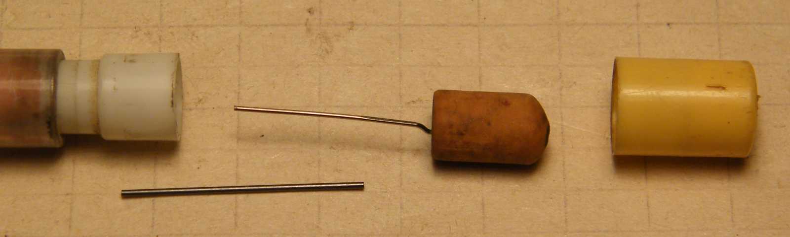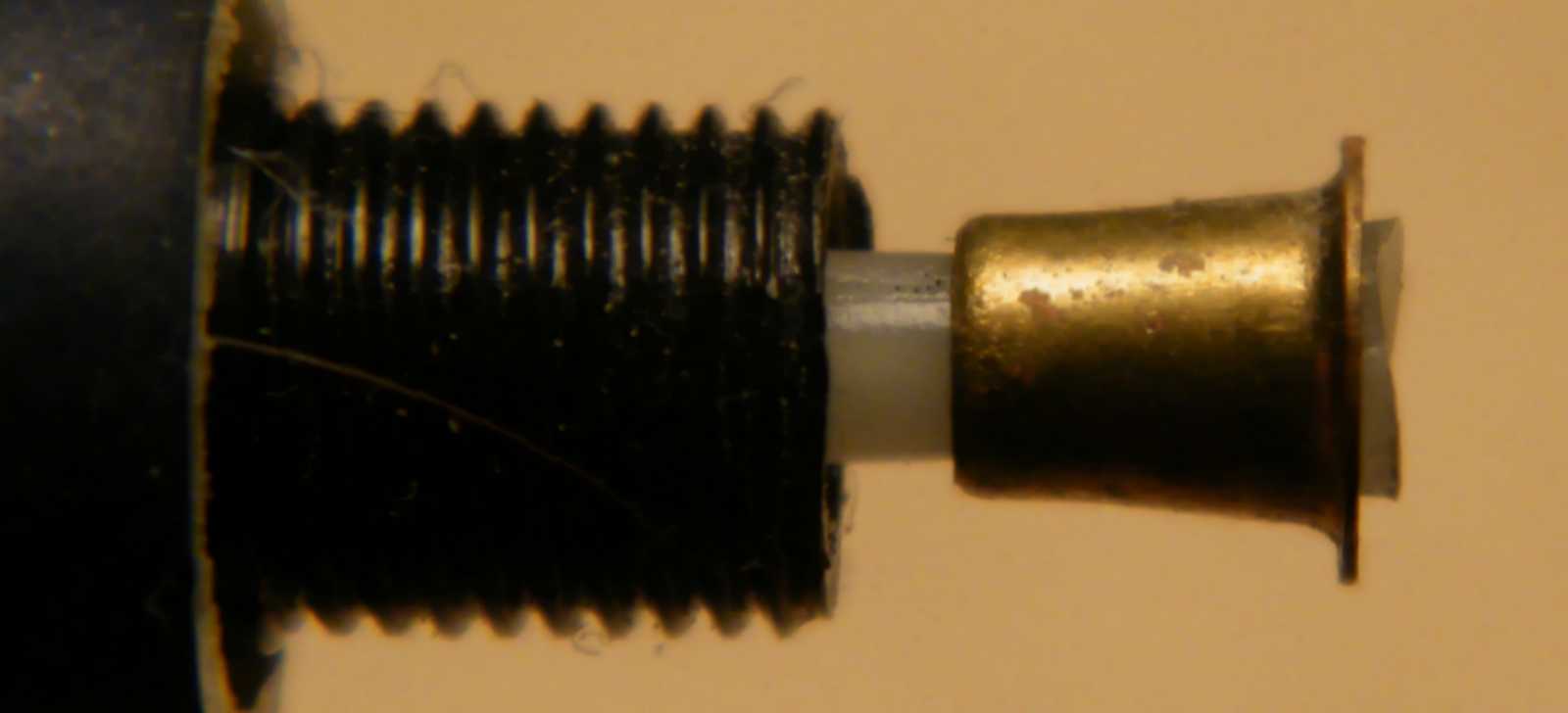 A ceruzavégi gombot a helyére visszatolva, azt megnyomva, kijött a menetes részből ez a tokmányszerű felépítmény. Ez úgy működik, hogy mikor a rugó (ami valahol a ceruza házában van) vissza, illetve belehúzza a fehér cső kúpos végét a szegecsforma kúpos réz bigyóba, akkor az ott megszorul. Mivel a fehér cső hosszában fel van vágva, így nemcsak meg, de össze is, amivel aztán stabilan megfogja a grafitból készült vékony rudat. |