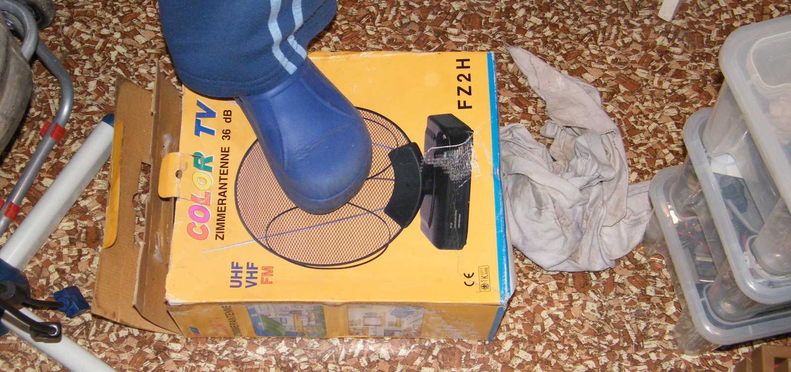 Majd pusztán segítségként megtaposta a mindent tipró klumpájával a másik erősítős szobaantenna dobozát, melyen a "COLOR TV" (megjegyzem csupa nagybetűs) feliratnak azért nincs semmi értelme, mert fizikailag nem létezik antenna külön a színes, és külön fekete-fehér vételre. |