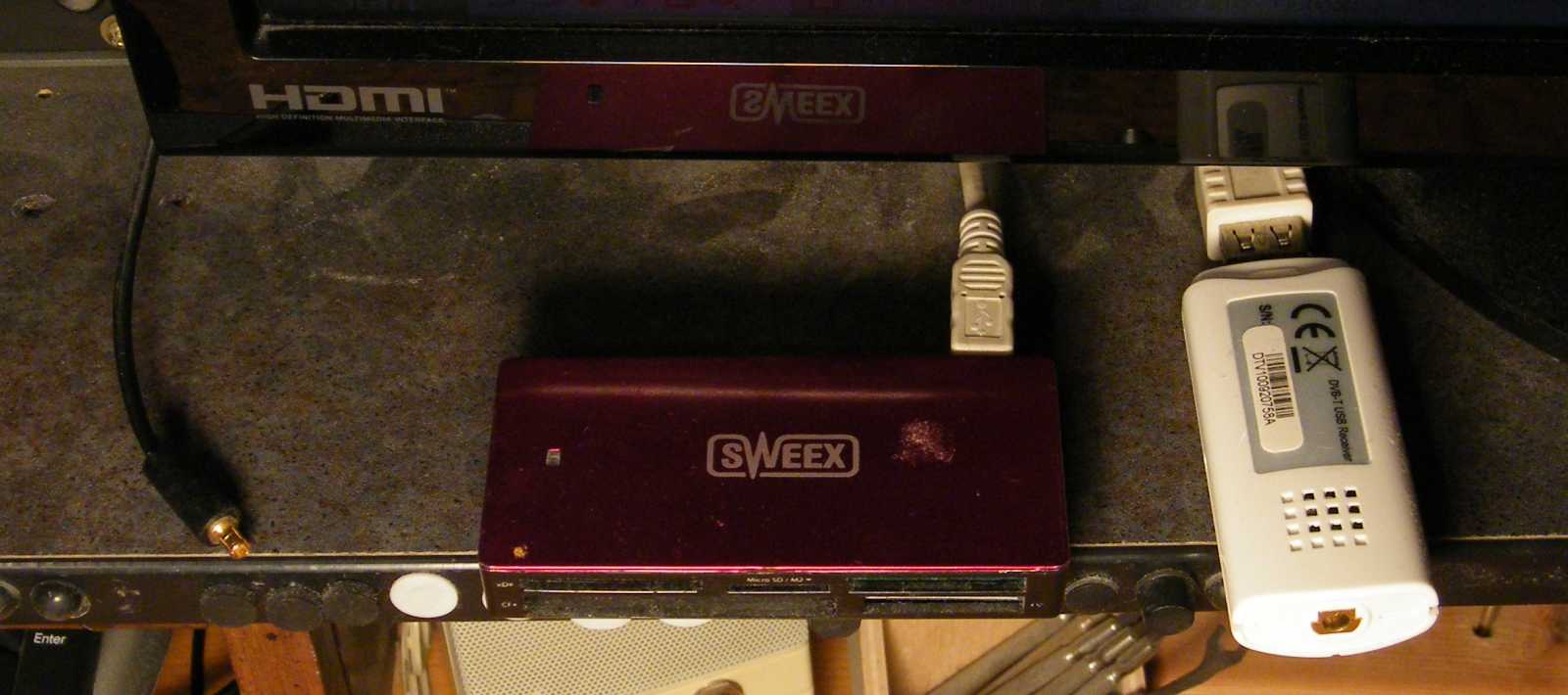 Gondoltam összeeresztem az antennát a DVB-t tunerrel is (lásd jobbra az apró fehér dobozt), hátha annak használ az antennajel növelése, csak mint az balra látható, olyan dugóm aztán végképp nincs. |