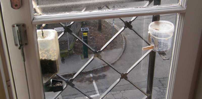 Első nap annyira megilletődtek a látványtól (mármint a cinegék), hogy fel sem jöttek az etetőig, inkább az előbbi képen lent látható virágládából csipegették ki a még korábban leszórt, akkor nekik valamiért nem tetsző magokat. |