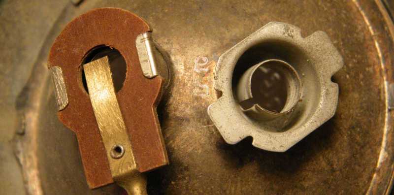 A kapcsolókart azért nem kellett leszerelnem, hogy megmutathassam ami alatta van, mert a másik lámpáról hiányzik. Egy kicsit mondjuk beletörölgethettem volna a lyukba, de azért így is látszanak a rézből készült érintkezők. |