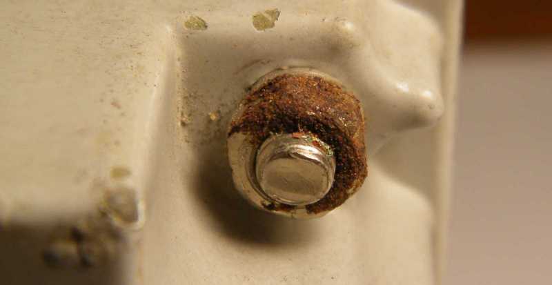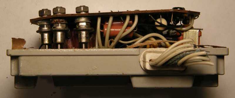 Hogy bejutott-e a dobozba a víz (bejutott), arra nagyszerű példa a középső dióda alátéteinek állaga. Hogy miért csak azok rohadtak el ennyire (a többi épp csak egy kicsit lett zöld), az valószínűleg valamiféle elektrokémiai hatásnak köszönhető. Amennyiben mégsem, akkor azokról az alátétekről egyszerűen csak lemaradt a gyárban a felületkezelés. |