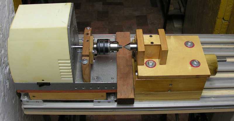 Az amúgy felesleges hegyet azonnal kivettem a tokmányból, mielőtt még belém találna állni. Mint az a gépágyra feltolt két gépelem közé betolt lécdarab csak úgy ránézésre szélességéből kiderül, nem kell a késtámasz anyagát az élére állítanom. Vagyis egyszerűen csak össze kell állítanom a rendelkezésemre álló mindenféle fadarabokból egy olyan tornyot, ami egyrészt odafogatható a gépágyhoz, másrészt mozgatható, harmadsorban pedig a teteje egy vonalba esik a tokmány és a csúcs középvonalával. |