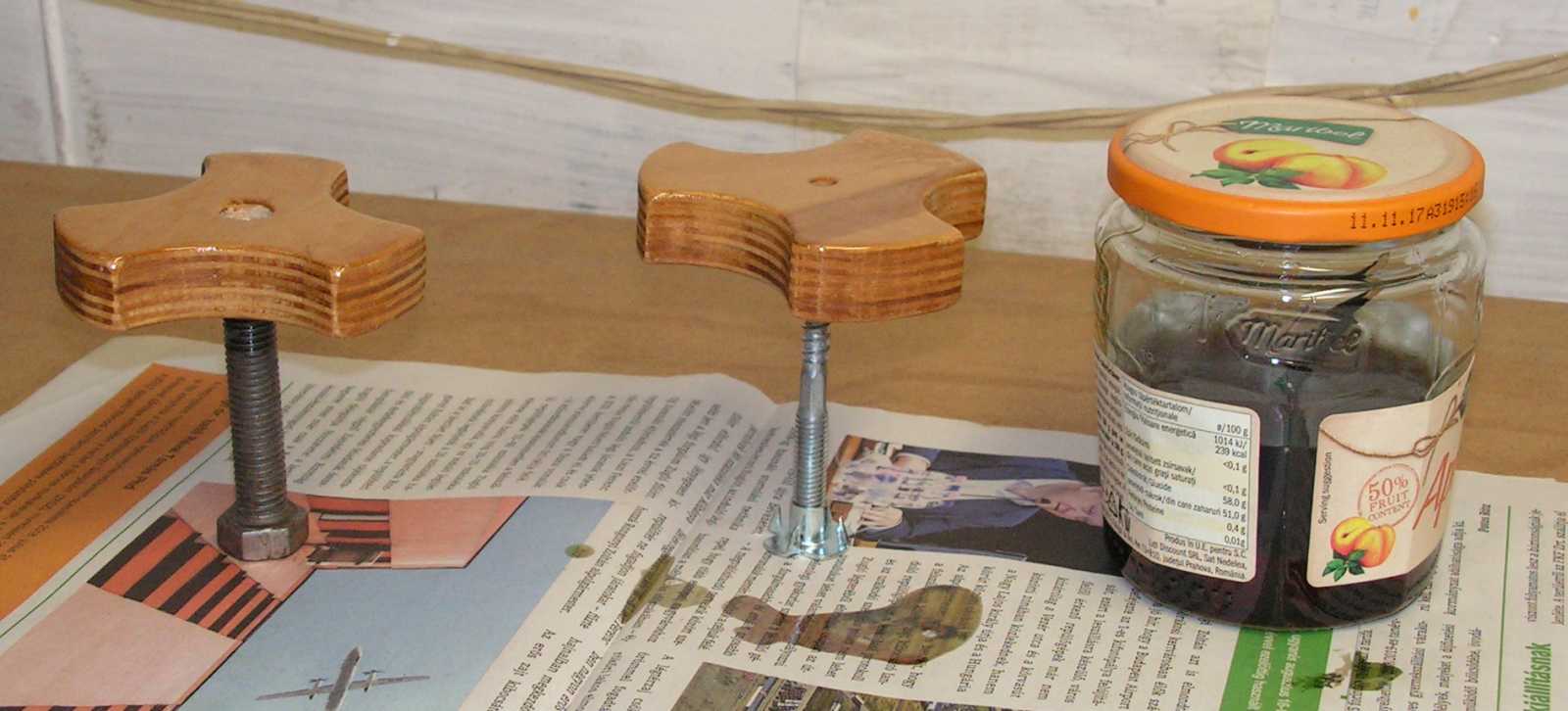 Íme az anya, amit az előző képen látható fadarabba fogok belesajtolni, míg amit felette látunk, az egy úgynevezett menetfésű, aminek direkt azért lett elgörbítve a vége, hogy szerszám nélkül is lehessen tekerni. No nem én görbítettem el, hanem már eleve így vettem a piacon. |