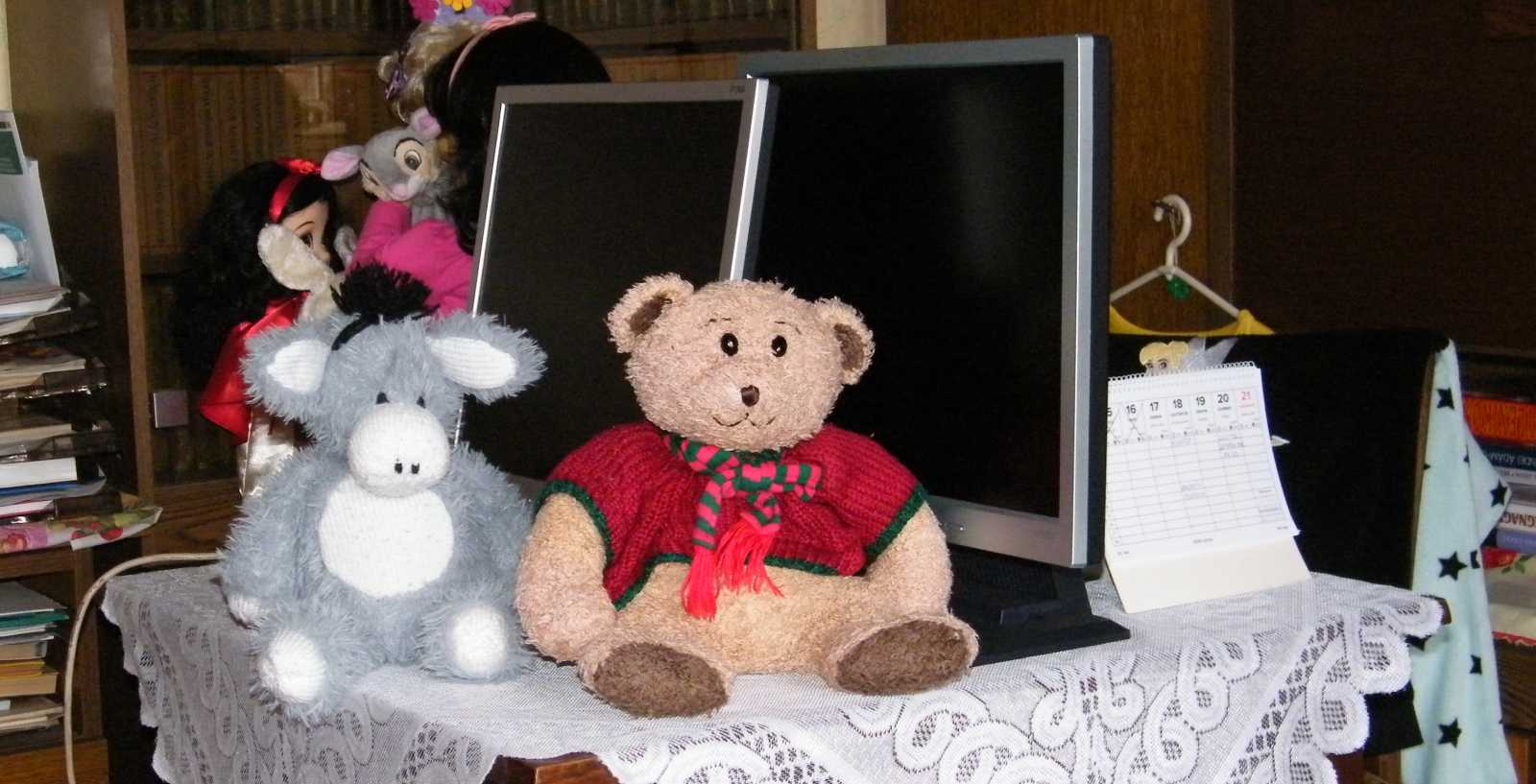 Mivel az ágyamon most épp nagyon útban voltak, a csacsi és a maci átkerült a szobai asztalra, a még mindig itt állomásozó monitorok mellé, ahonnan aztán - míg én az ágyneművel bajlódtam - végigbámulhatták az egész égiháborút. Már úgy értem, hogy tényleg leszakadt odakint az ég. Míg a csacsinak a füle is szétáll a meglepetéstől, addig a maci annak örül, hogy a vihart bentről nézi. |